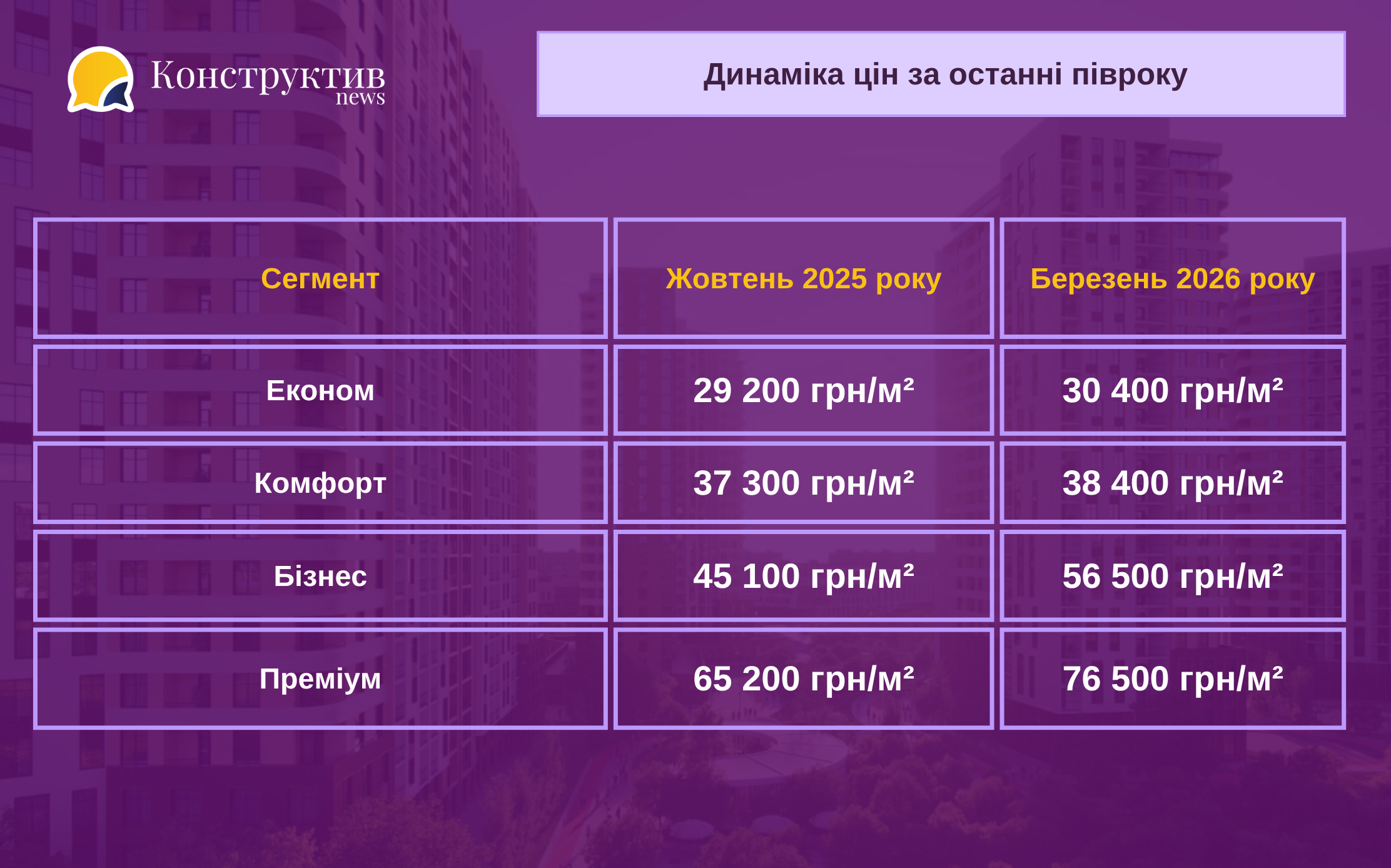 Якщо ж розглядати питання у розрізі класів житла, а саме проводити аналіз зростання цін за останні півроку (жовтень 2025 р. - березень 2026 р.), то можемо прослідкувати певні особливості, що обумовлені не лише стандартною структурою попиту та пропозиції, а й рівнем платоспроможності покупців, що є вирішальним у цьому питанні.