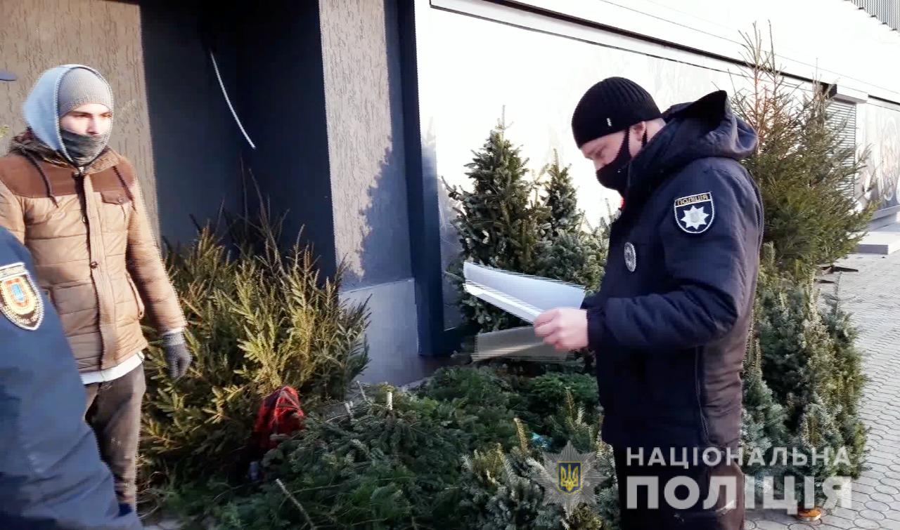 Одесские полицейские проверяют продавцов хвойных деревьев на соблюдение законодательства. Торговцев просят предоставить документы на деревья, которые выставлены на продажу.