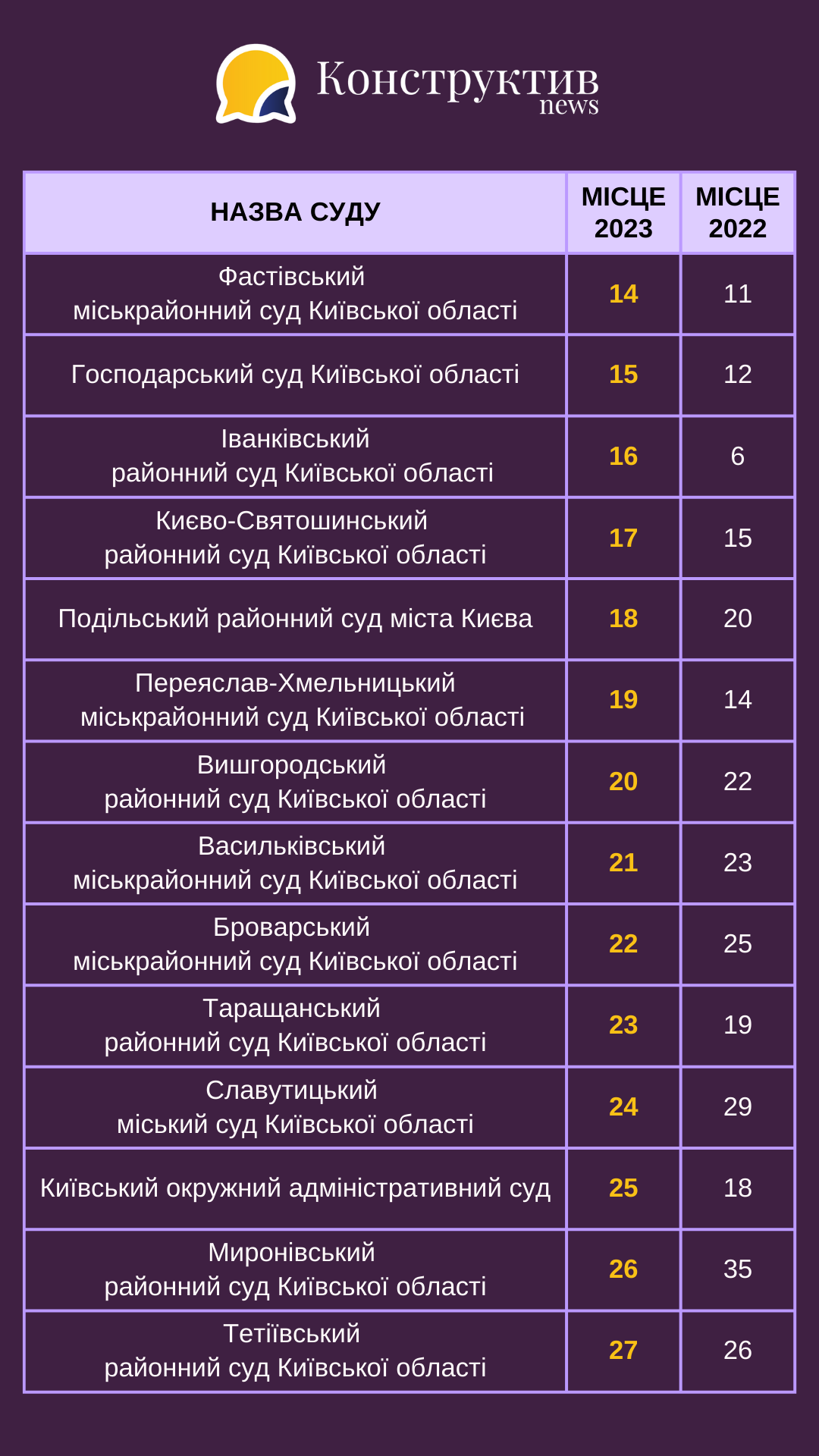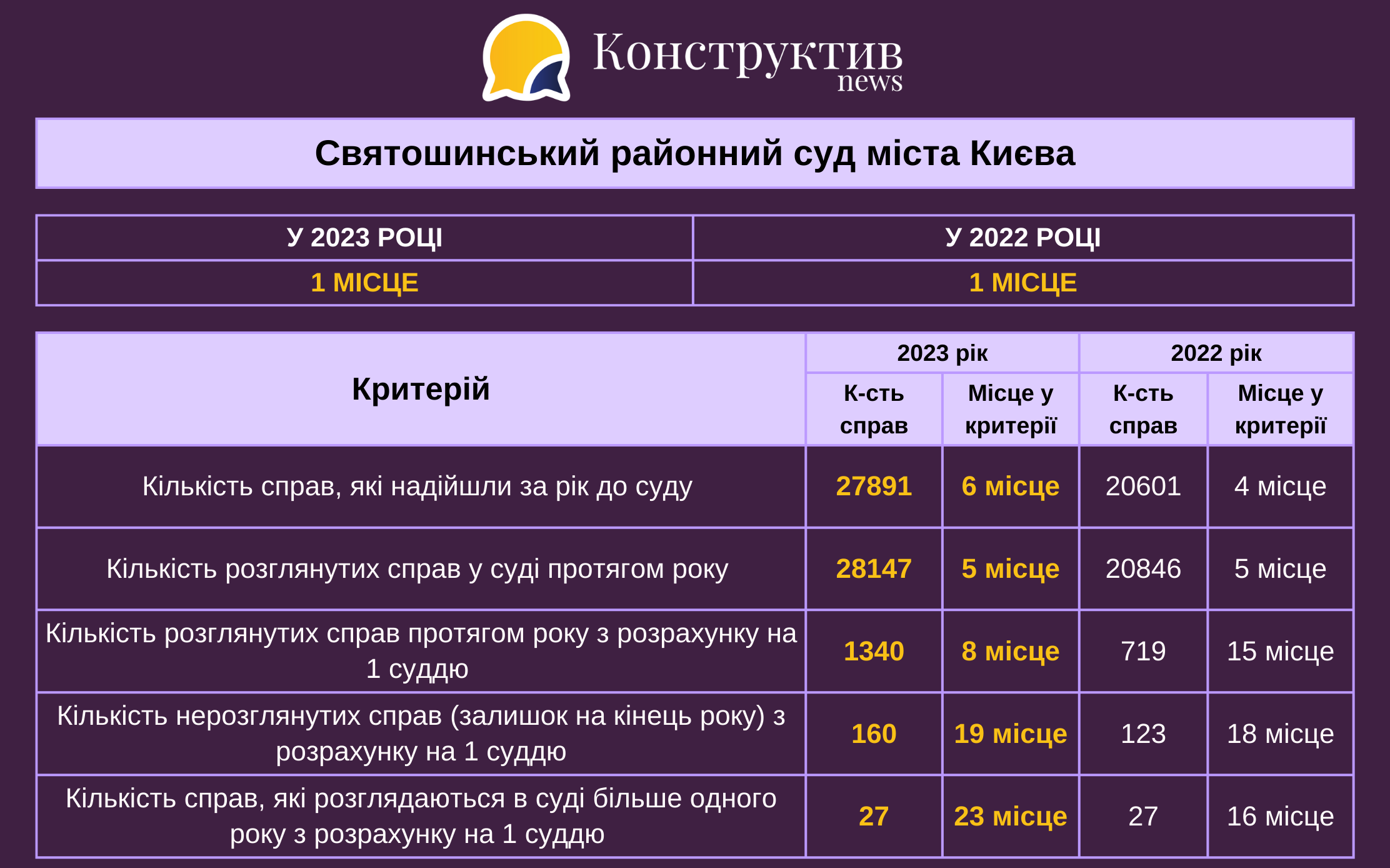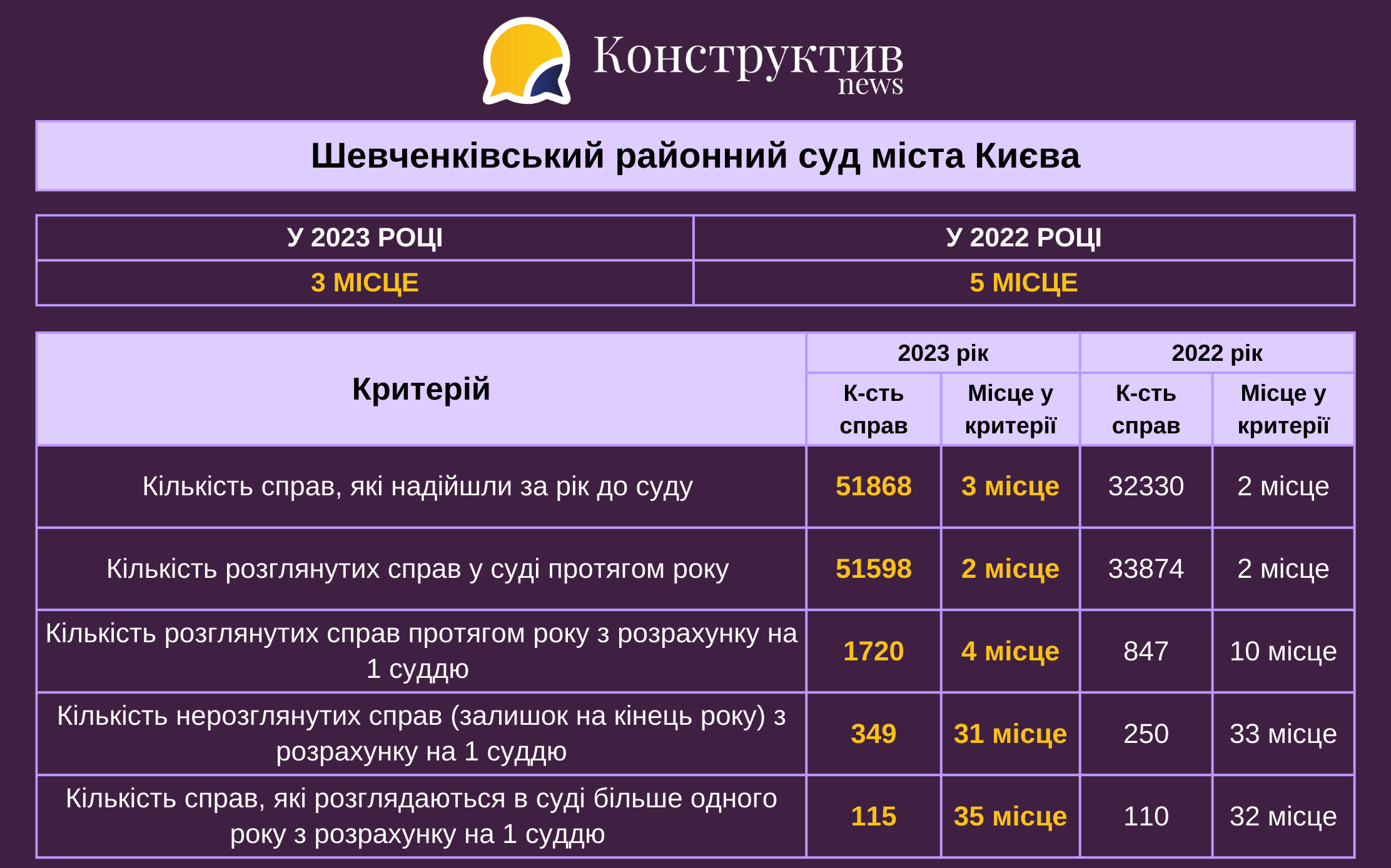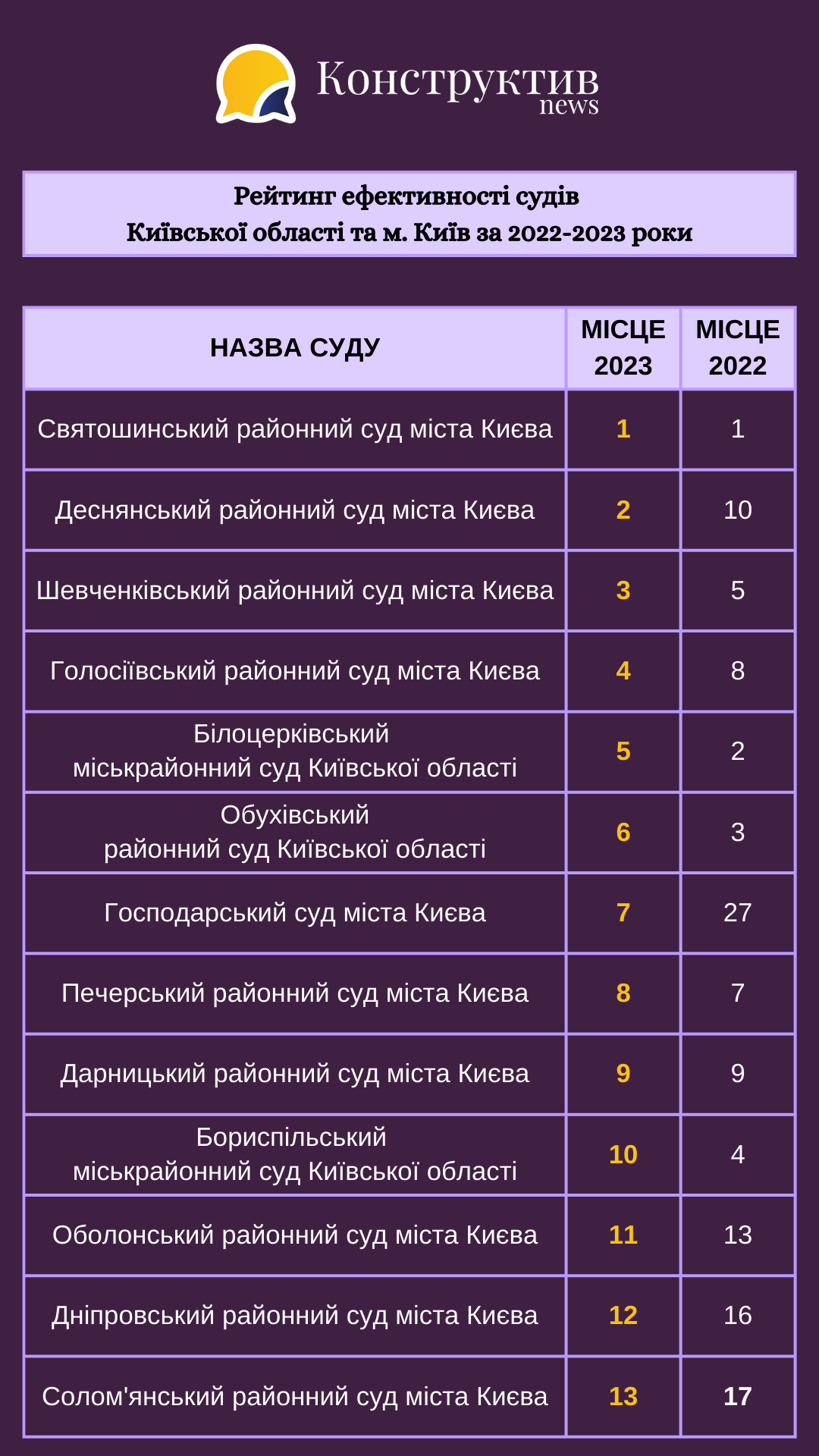 Інформаційне агентство «КонструктивNEWS» та громадська організація «Спілка юристів Одеської області» продовжують аналізувати роботу судів України, тож об'єднали зусилля для реалізації проєкту "Рейтинг ефективності судів Київської області та м. Київ за 2022-2023 роки". Мета проєкту - оцінити роботу судів в умовах повномасштабної війни, висвітлити їхні здобутки та виклики, а також продемонструвати стійкість та прагнення до забезпечення правосуддя.