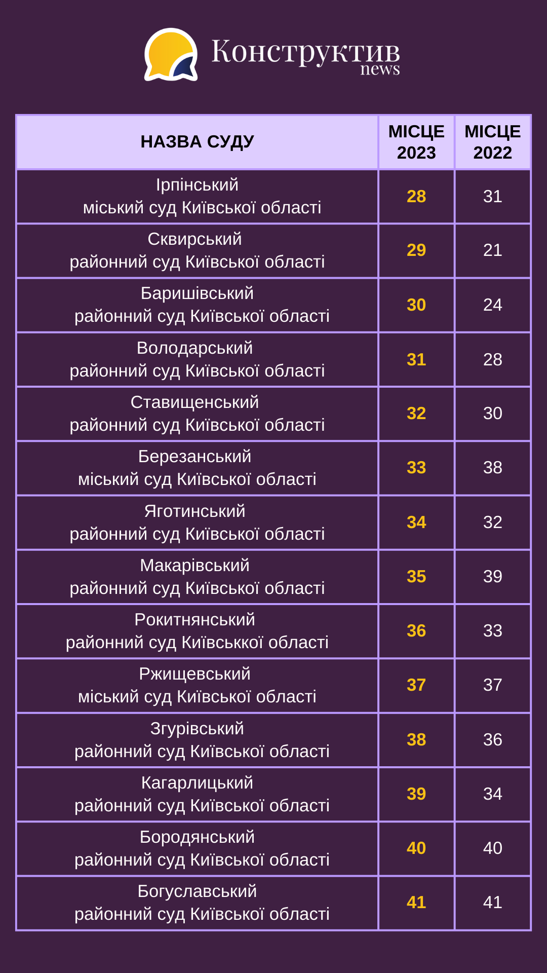 До рейтингу потрапили усі суди першої інстанції Київської області та м. Київ (41 судова установа).