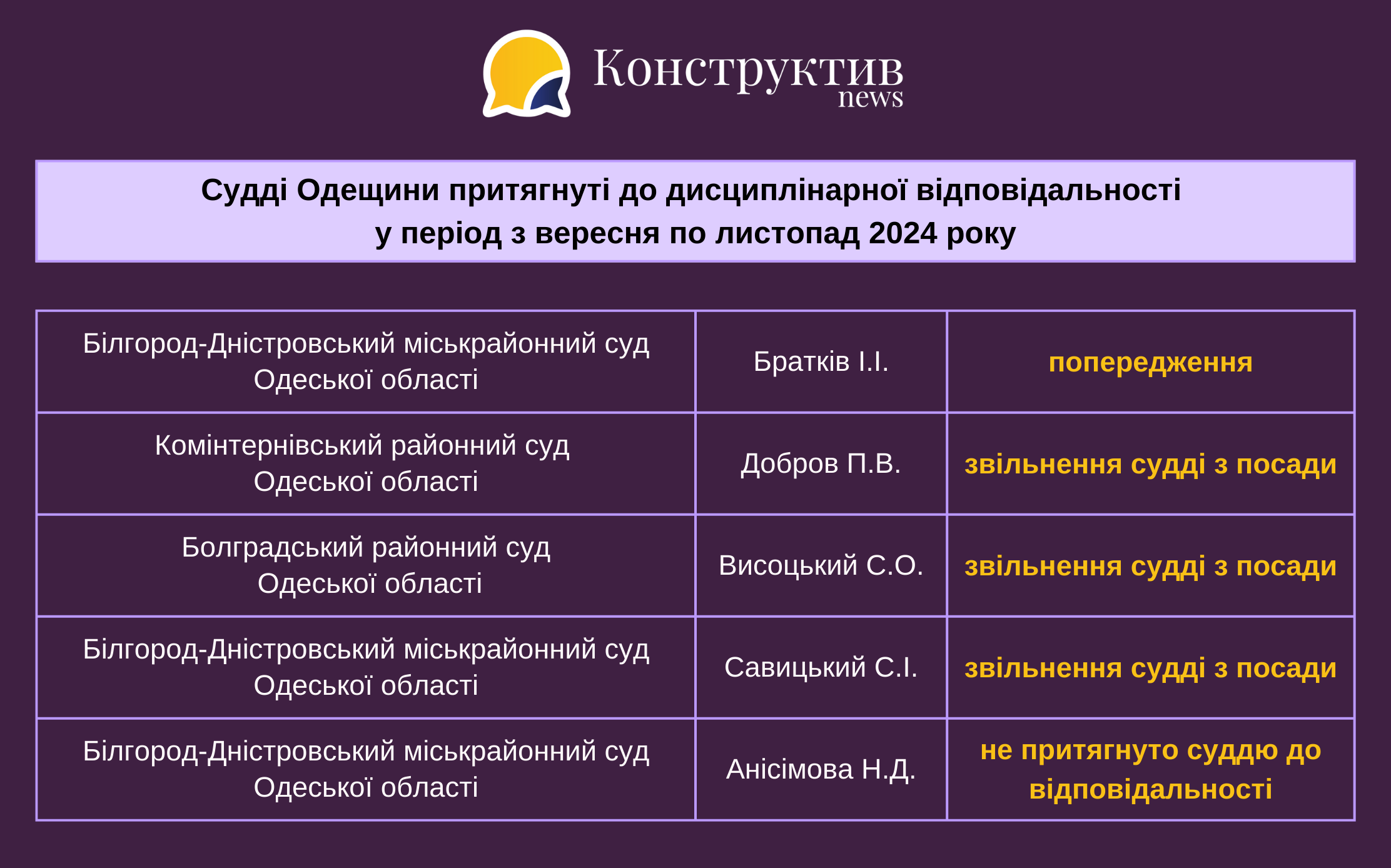 У період з вересня по листопад 2024 року, Вища рада правосуддя розглянула п’ять скарг щодо притягнення суддів Одещини до дисциплінарної відповідальності. За результатами розгляду скарг, чотирьох суддів притягнуто до дисциплінарної відповідальності та лише до одного з них застосовано дисциплінарне стягнення у виді попередження. До інших застосовано дисциплінарне стягнення у виді подання про звільнення судді з посади.