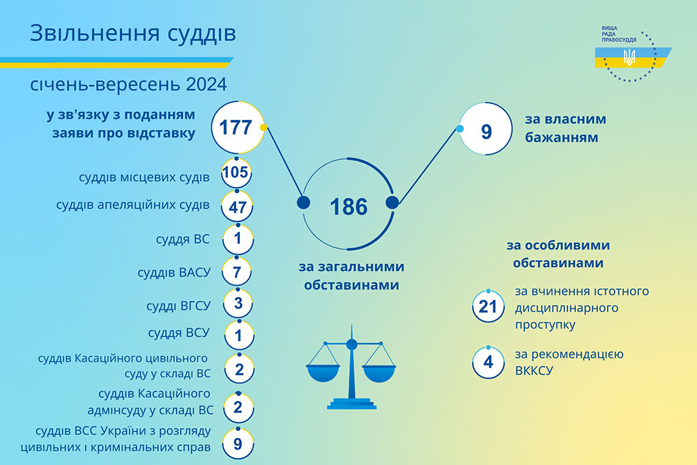 За загальними обставинами звільнено 186 суддів, а саме: