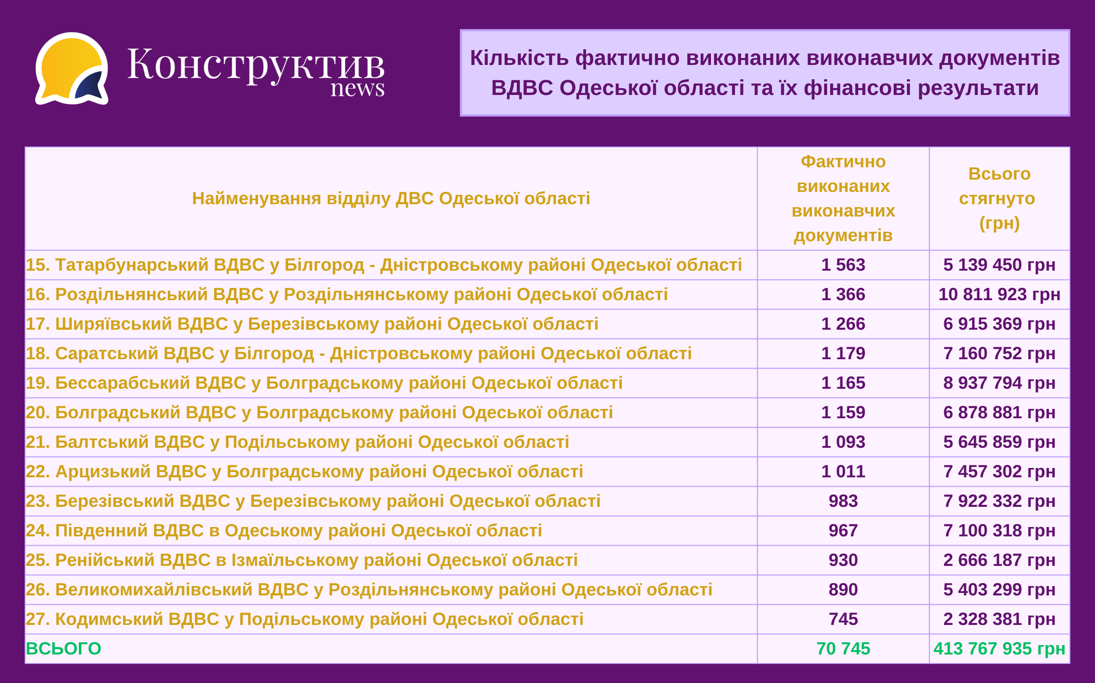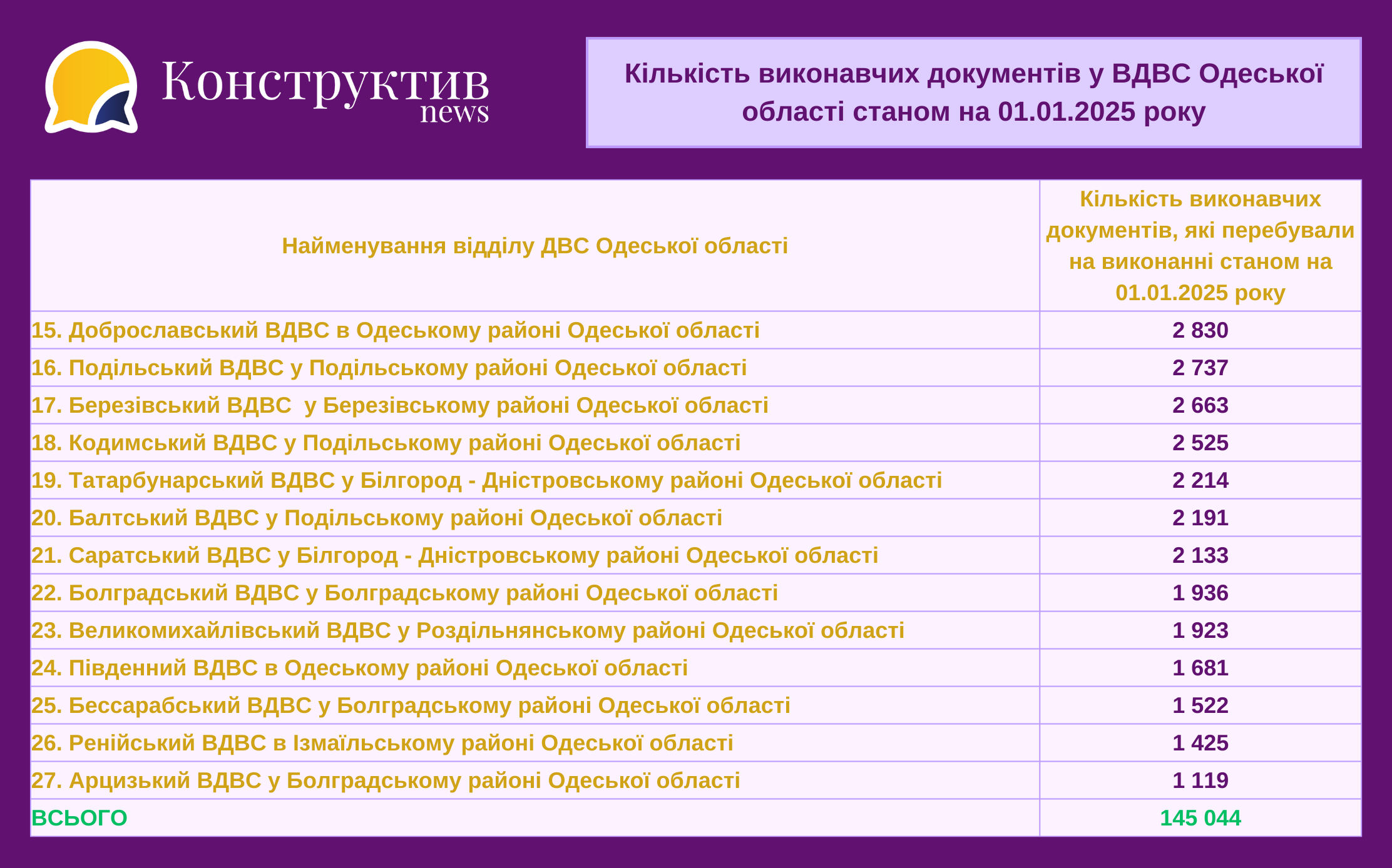 - Хаджибейський ВДВС у м. Одесі - 27 059 виконавчих проваджень;