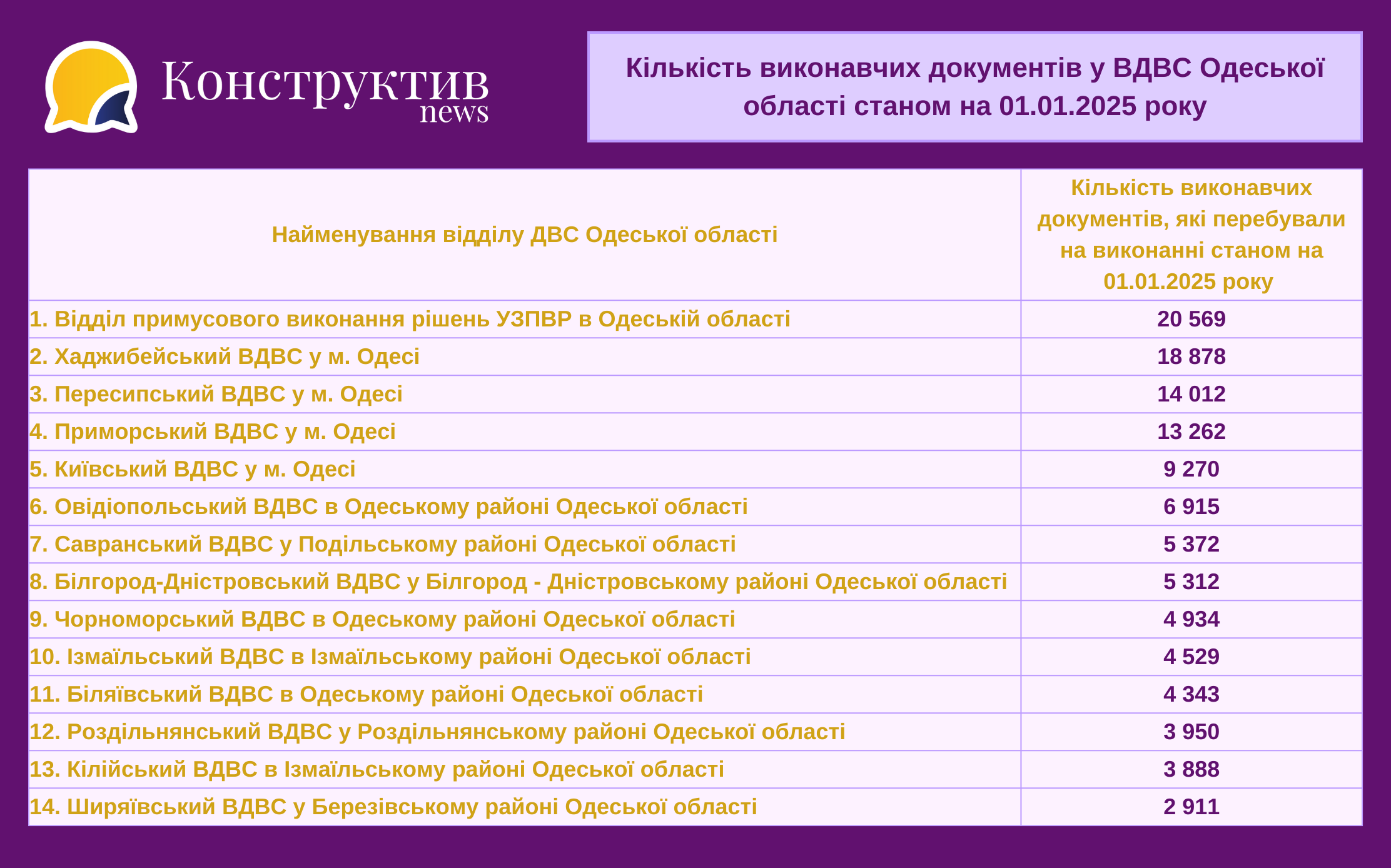 - Відділ примусового виконання рішень УЗПВР в Одеській області - 20 569 виконавчих проваджень;
