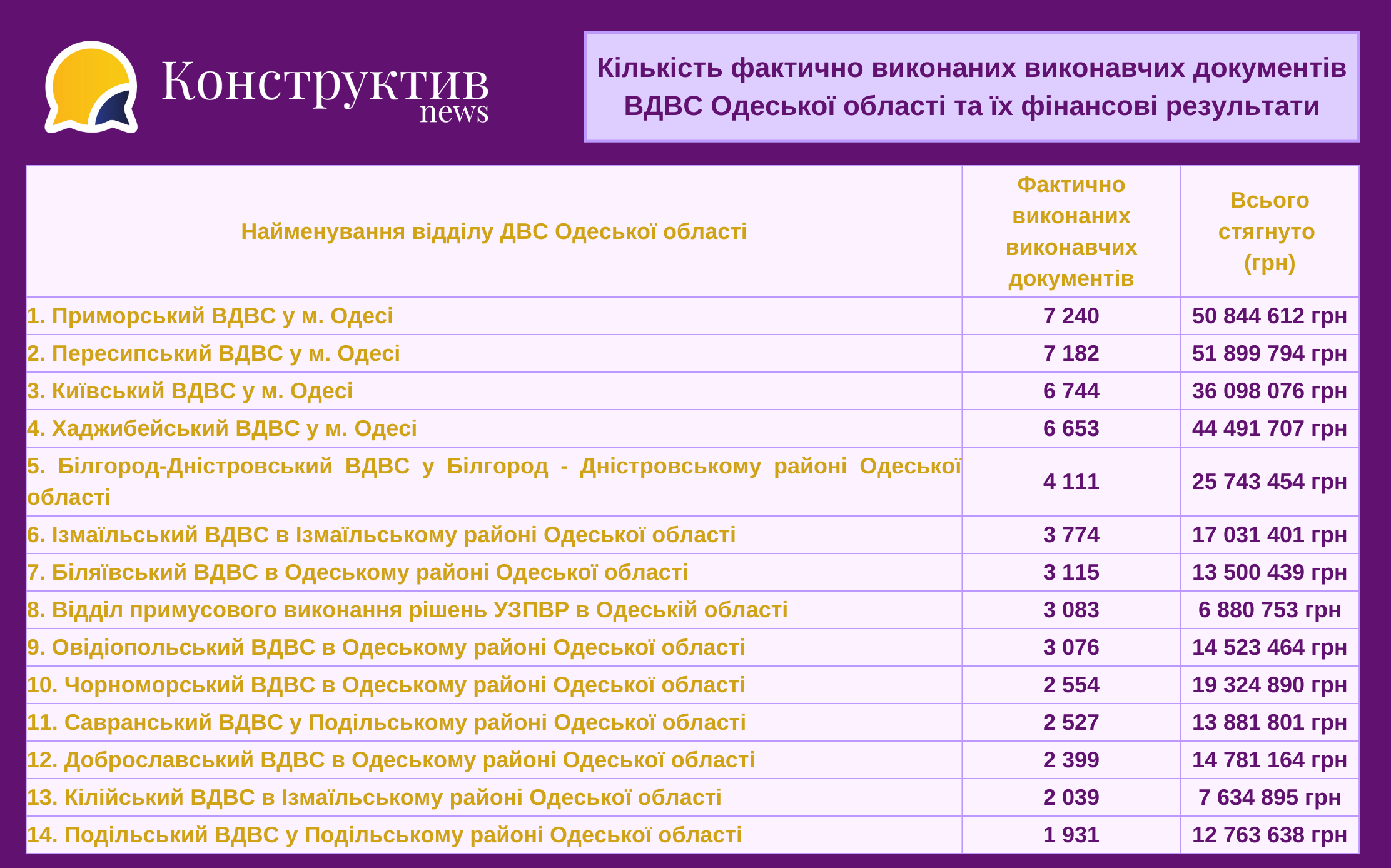Найбільші суми стягнули такі відділи ДВС Одеської області: Пересипський ВДВС у м. Одесі (понад 51 млн грн), Приморський ВДВС у м. Одесі (понад 50 млн грн), Хаджибейский ВДВС у м. Одесі (понад 44 млн грн), Київський ВДВС у м. Одесі (понад 36 млн грн), Білгород-Дністровський ВДВС у Білгород - Дністровському районі Одеської області (понад 25 млн грн).
