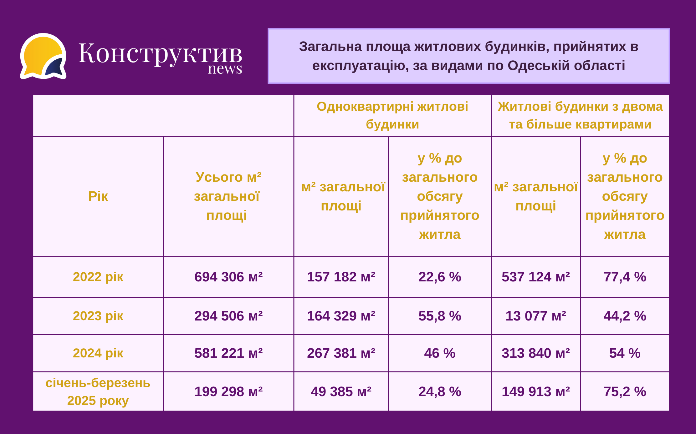 Дані Головного управління статистики свідчать про те, що житлове будівництво Одещини демонструє значну стійкість та здатність до відновлення після падіння у 2023 році. Збільшення частки багатоквартирних будинків та стабільні обсяги будівництва на Одещині підтверджують, що попит на нове житло залишається високим, що є важливим індикатором економічної активності регіону та позитивним сигналом для інвесторів.