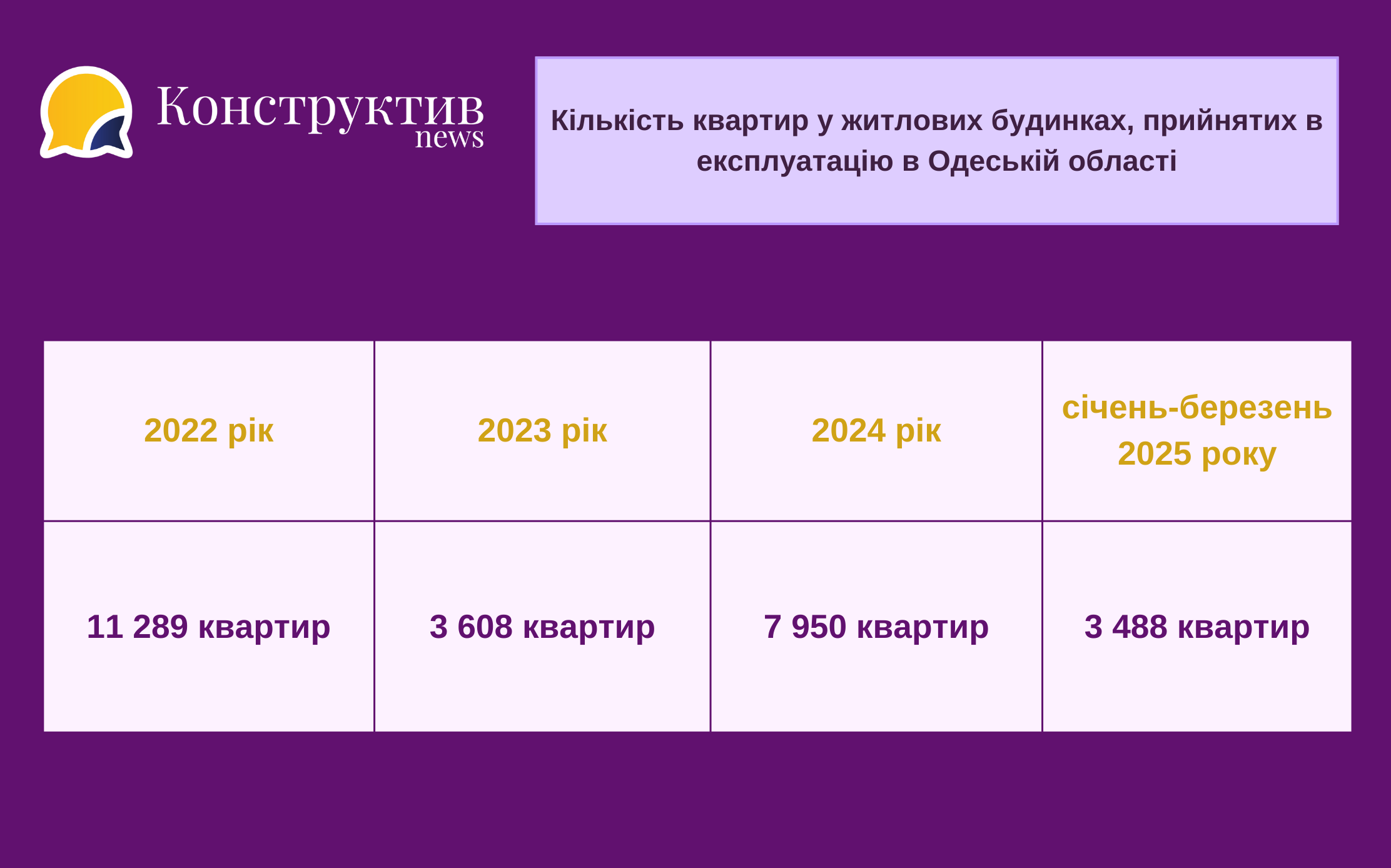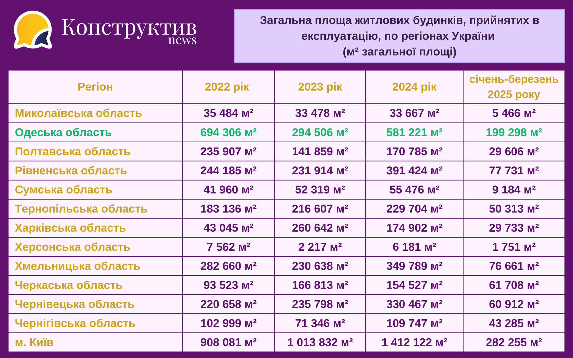 Наразі, за результатами першого кварталу 2025 року Одеська область посідає 4 місце за обсягом прийнятого в експлуатацію житла поступаючись м. Києву (282,2 тис. м²), Київській (444,2 тис. м²) та Львівській (260,6 тис. м²) областям.