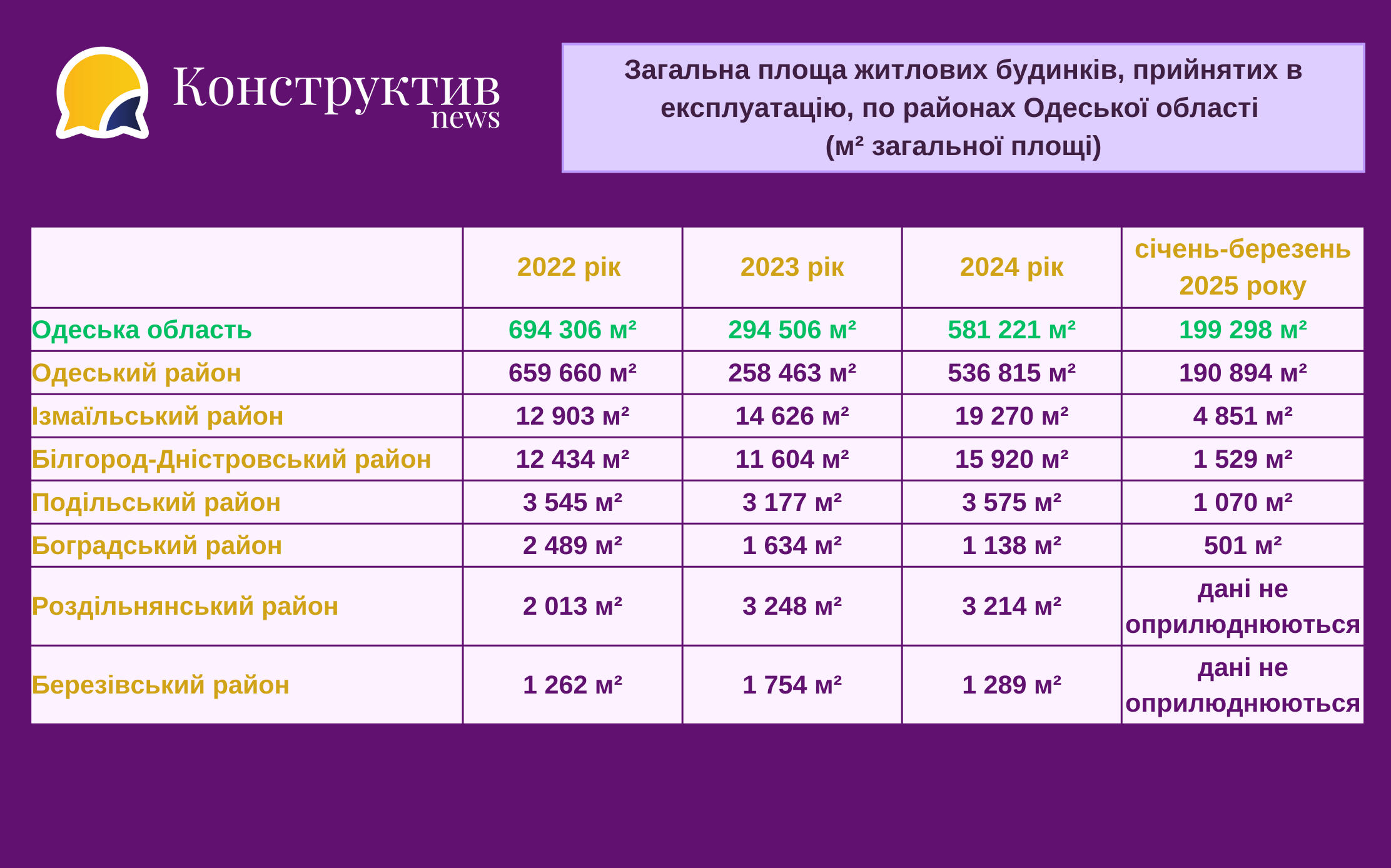 Що стосується інших районів Одещини, то у Подільському районі у 2022 році було введено в експлуатацію 3,5 тис. м², у  Болградському - 2,5 тис. м², у Роздільнянському - 2 тис. м², а у Березівському - 1,3 тис. м².