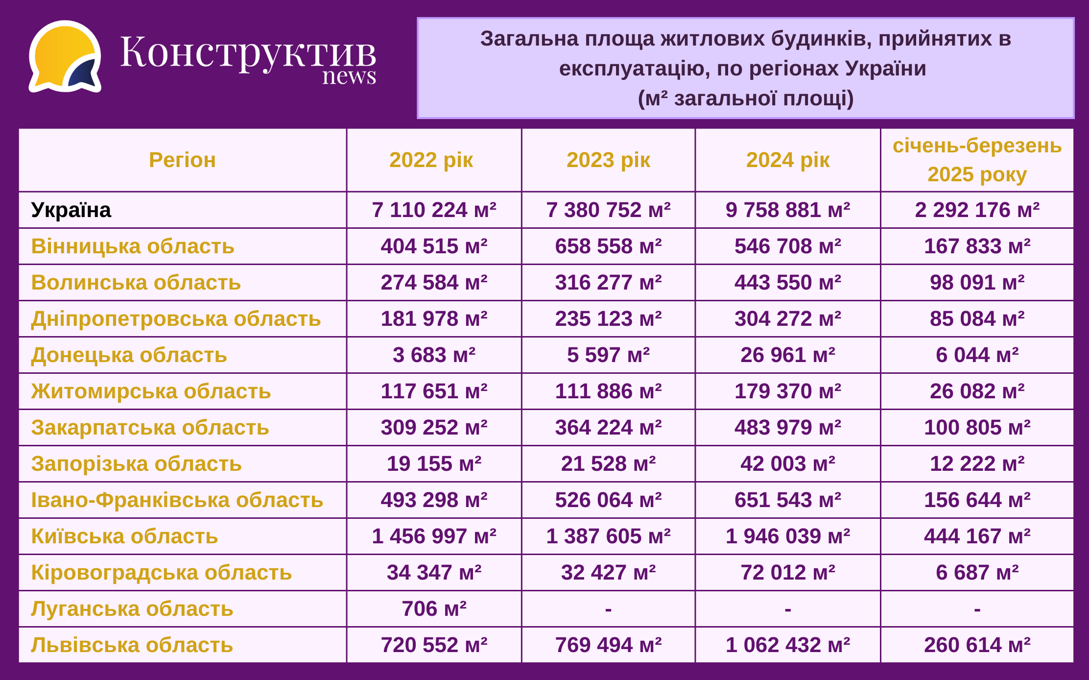 2025 рік також демонструє позитивну динаміку, саме тому лише у першому кварталі 2025 року було прийнято в експлуатацію 199 298 м² житлових будинків, що свідчить про стабілізацію та адаптацію будівельного сектору до викликів сьогодення.